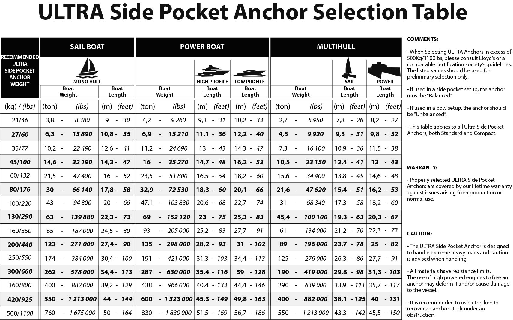 - This table applies to all Ultra Pocket Anchors, both Standard and Compact.