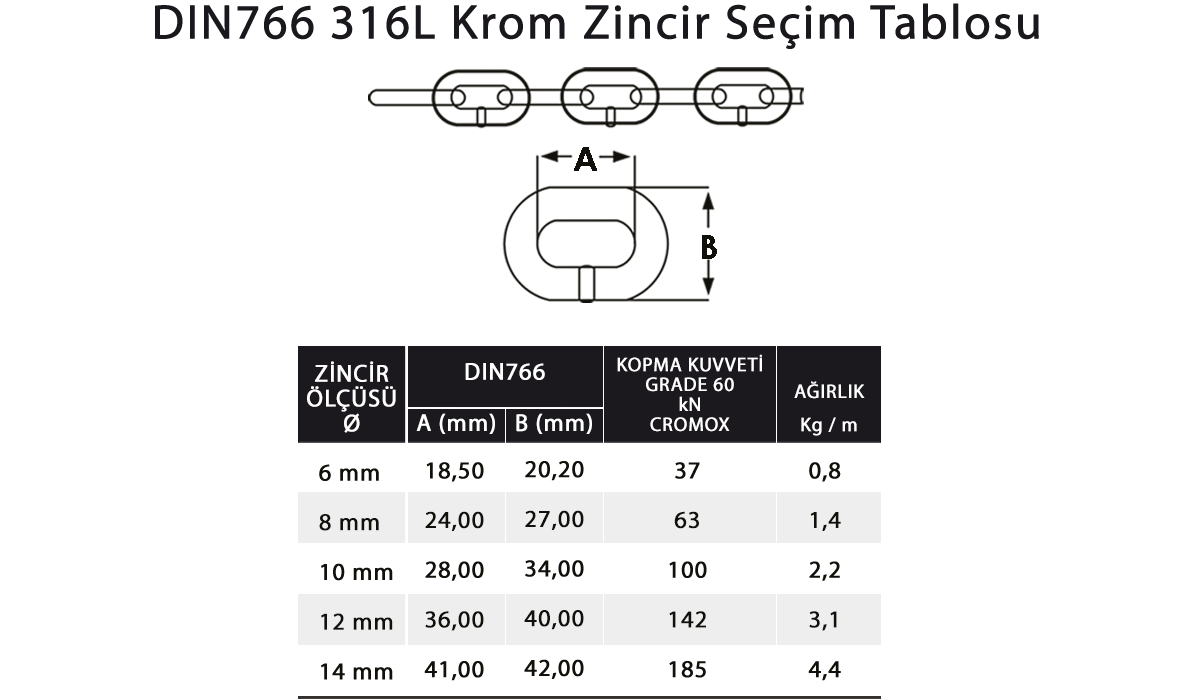 DIN766 AISI 316L krom zincirler, korozyon dayanımı en yüksek olan düşük karbonlu 316L kalite paslanmaz çelikten üretilmektedirler. Malzeme garantisiyle gelen bu zincir, zincirliğinde akışkanlık ve yığılma problemi olan, galvaniz zincirini daha fazla galvanizletmek istemeyen ya da teknesinde görünüme önem veren denizciler için ideal çözümdür. 316L kalite zincirinizin mil kısmında olduğu gibi kaynak yerlerindede pas yapmayacaktır. Mükemmeli arayanlar için, zincir teknolojisinin geldiği son nokta olan 316L Grade 60 CROMOX krom zinciride artık müşterilerimizin tercihine sunuyoruz.